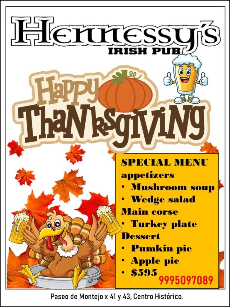 Celebrate Thanksgiving at one of Mérida’s favorite expat hangouts right on Paseo de Montejo. Hennessy’s serves up a traditional menu in a lively, friendly atmosphere that feels like home.